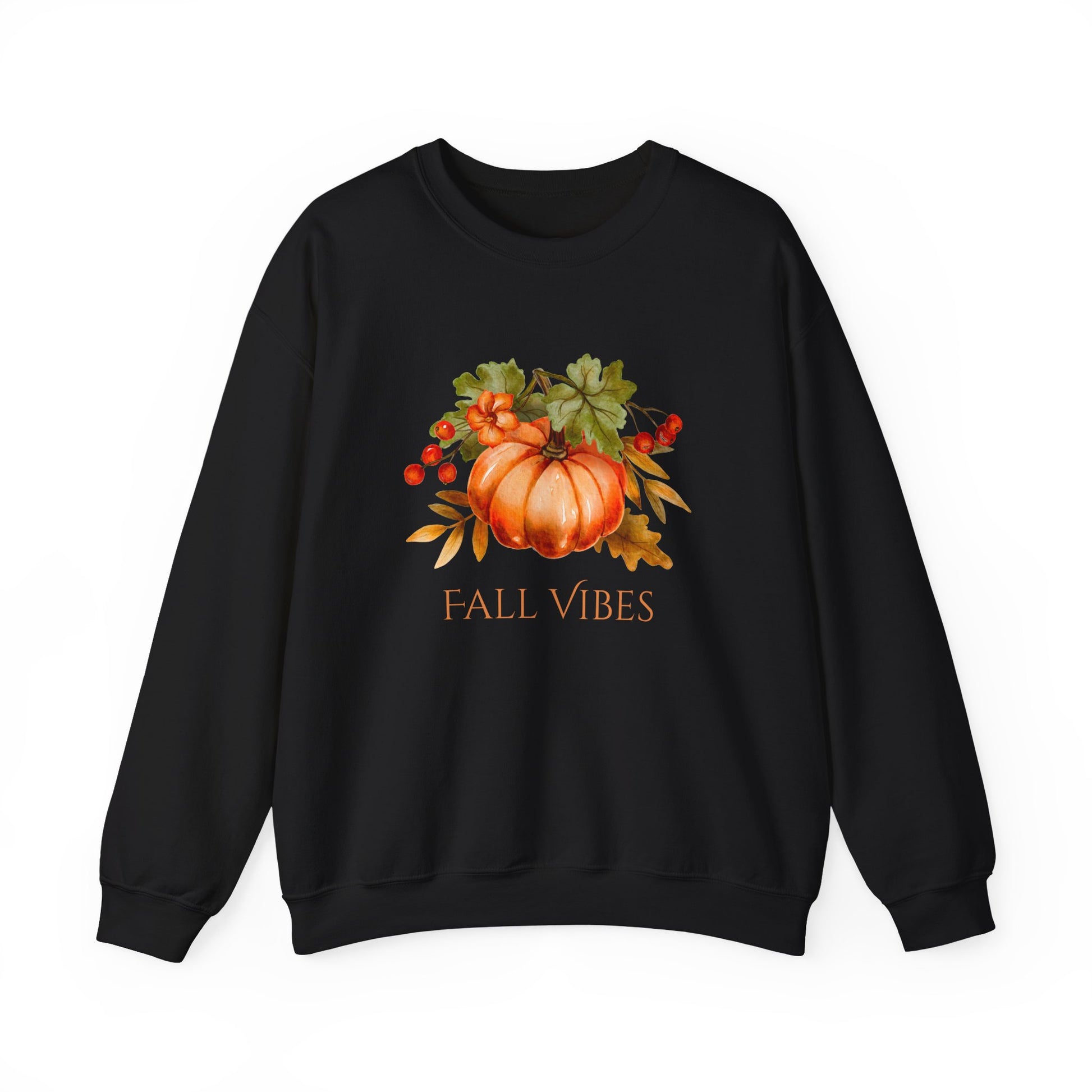 Wrap yourself in slow, golden afternoons with this cozy crewneck. A plump watercolor pumpkin rests among warm leaves and berries, the words “FALL VIBES” sitting beneath in a soft, rustic tone. Lightweight yet substantial, the black background makes the autumn palette sing — think walks through crunchy leaves, mugs warming your hands, and quiet evenings pulled under a throw. The classic crew silhouette keeps the look relaxed and easy to layer; wear it to a pumpkin patch, a casual harvest dinner, or when you want to bring a little seasonal calm to your daily routine. The artwork feels hand-painted and intimate, a subtle way to celebrate the season without shouting for attention.