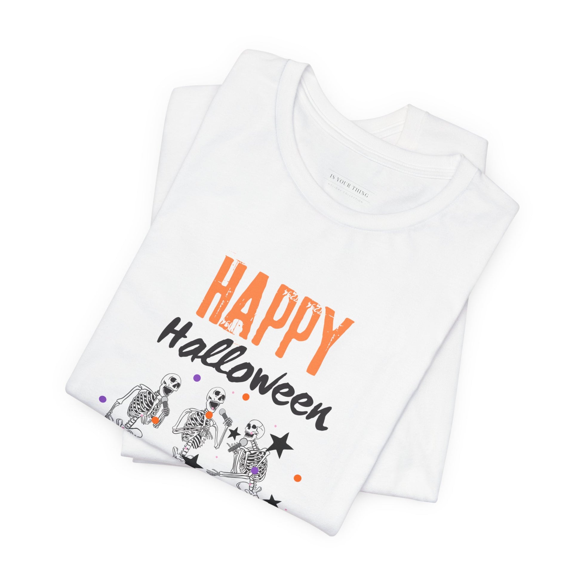 Happy Halloween Skeleton Unisex Tee (White) (Also Available in Kids Holiday Collection)