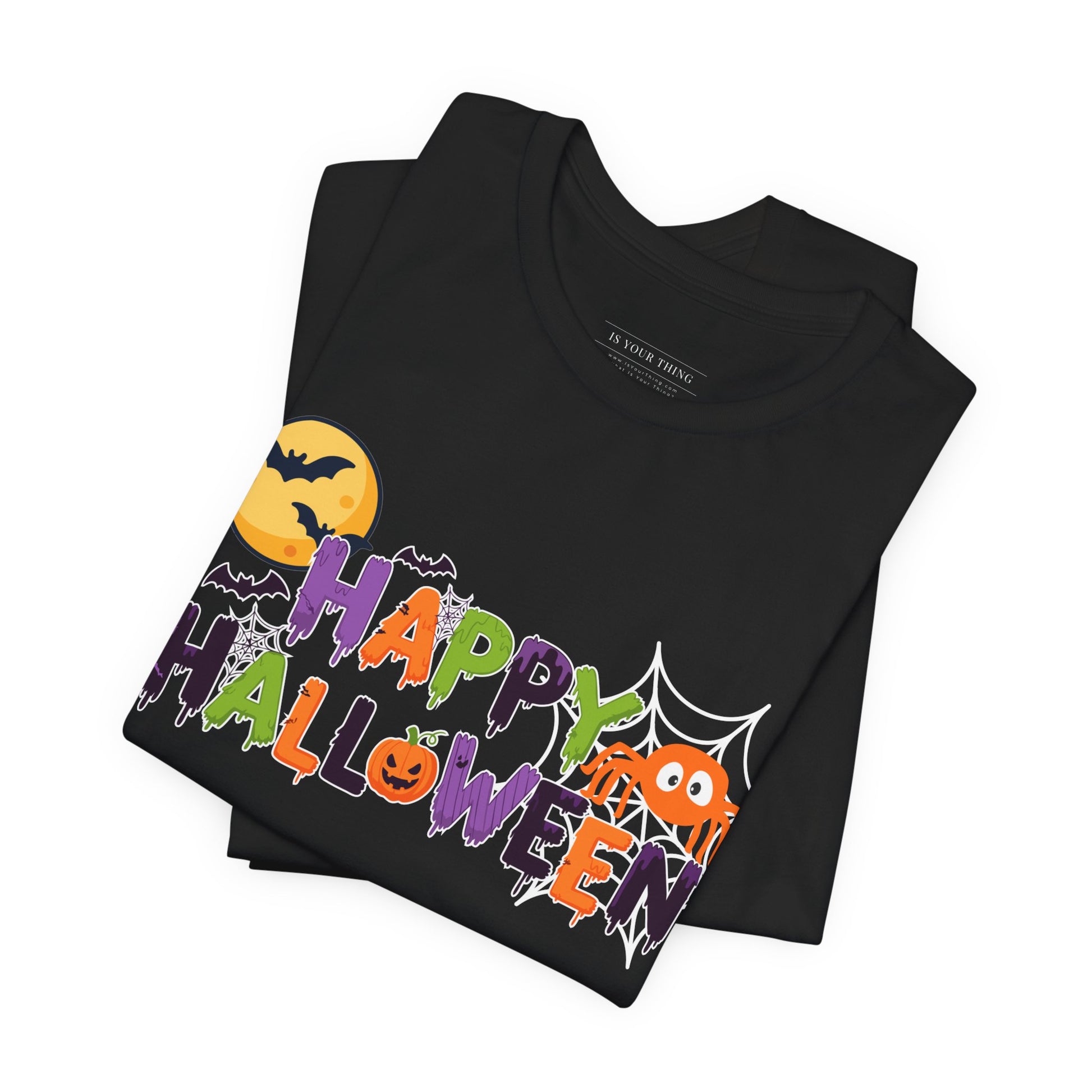 This lightweight jersey tee brings playful Halloween energy without shouting. Soft Airlume cotton and a stretch ribbed collar make it comfortable for long evenings handing out treats or sitting by a bonfire. The front artwork — colorful, slightly spooky lettering with a grinning pumpkin, moon, bats and a spiderweb — feels whimsical and familiar, the kind of shirt you reach for when you want to join the fun but stay cozy. It layers easily under jackets or over long sleeves and has a neat retail fit that keeps the silhouette tidy while letting the design be the star.