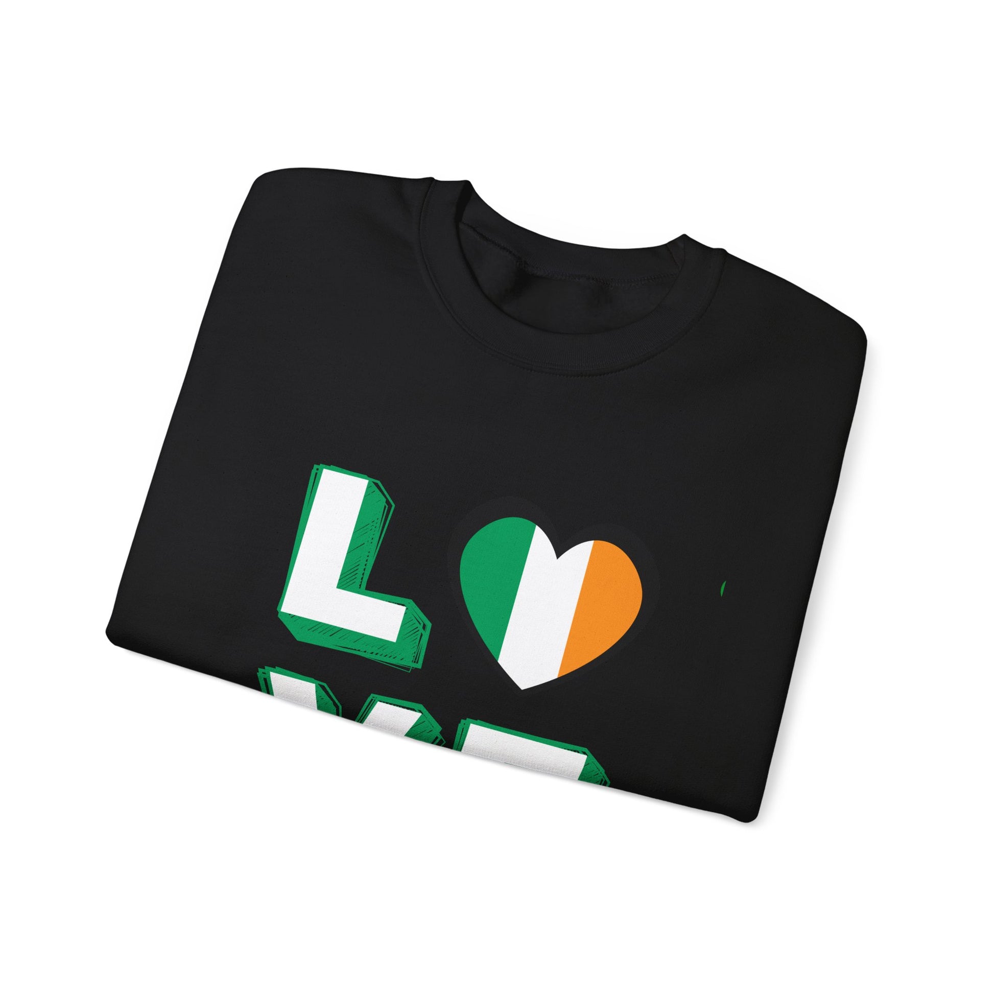 This soft, mid-weight crewneck brings a quiet, everyday way to wear Irish pride. The bold ‘LOVE’ graphic uses a heart in the green-white-orange of the Irish flag, layered with a subtle drop shadow that pops against the deep black fabric. The classic crew shape and clean lines make it easy to toss on for brisk walks, pub nights, or a relaxed weekend at home. It feels lived-in from the first wear — cozy ribs at the cuffs and hem hold their shape, while the smooth cotton-poly blend drapes without bulk. Thoughtful details like tear-away neck labels and durable double-needle stitching mean this sweatshirt is built to be worn often, not boxed away. Whether you’re heading to a St. Patrick’s gathering or simply layering up for chilly mornings, this sweatshirt reads like an approachable, stylish nod to Irish roots.
