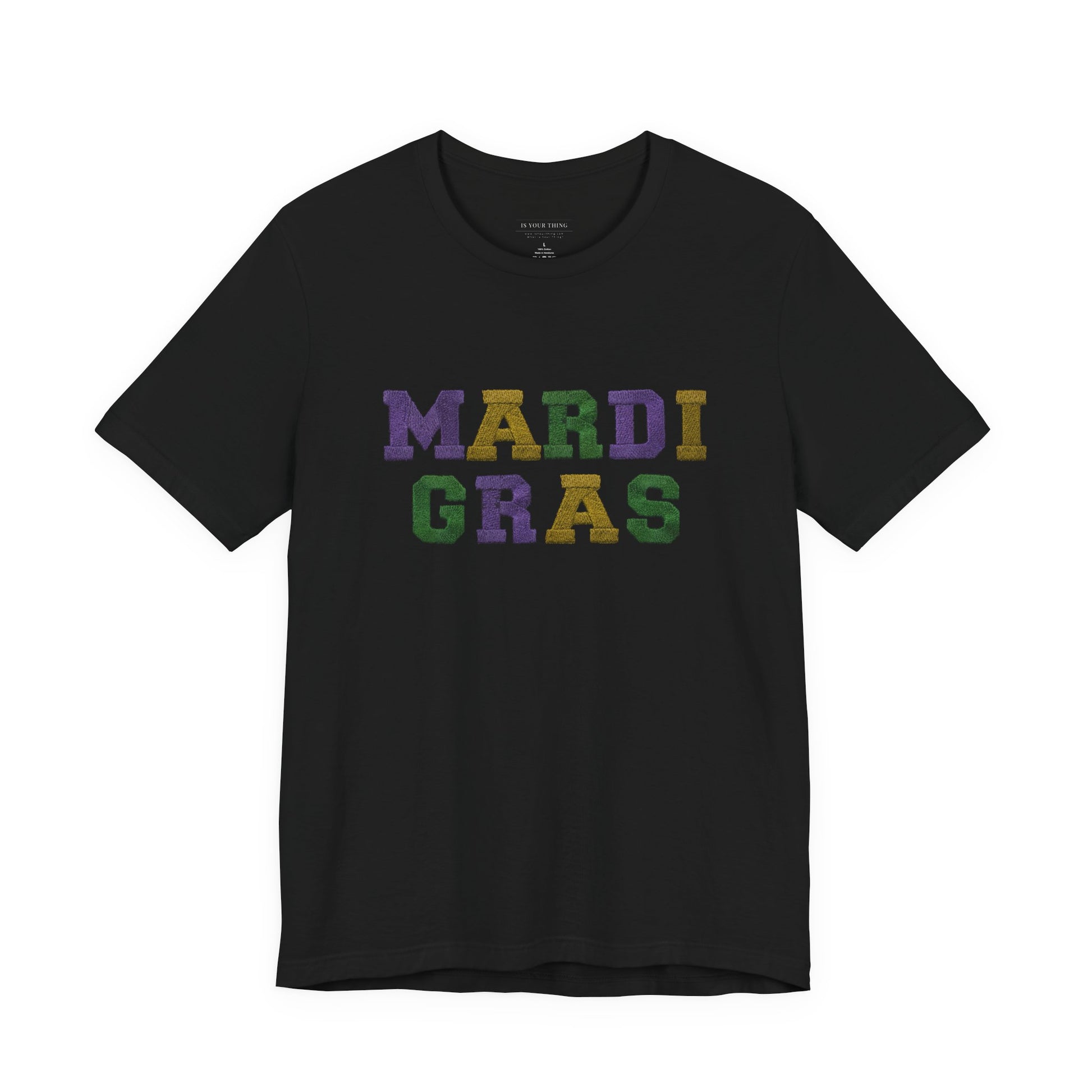 Feel the city pulse and the parade energy in this lightweight cotton tee. Bold, blocky letters spell out MARDI GRAS in the classic purple, green, and gold—colors that call up confetti, brass bands, and late-night laughter. The fit sits clean and casual at the crew neck, easy to layer under a jacket or wear alone when you want to move through crowds with comfort and confidence. Soft, breathable Airlume cotton lets you dance, cheer, and roll from street to balcony without feeling weighed down. This shirt reads like a celebration: simple, loud, and made to be lived in.