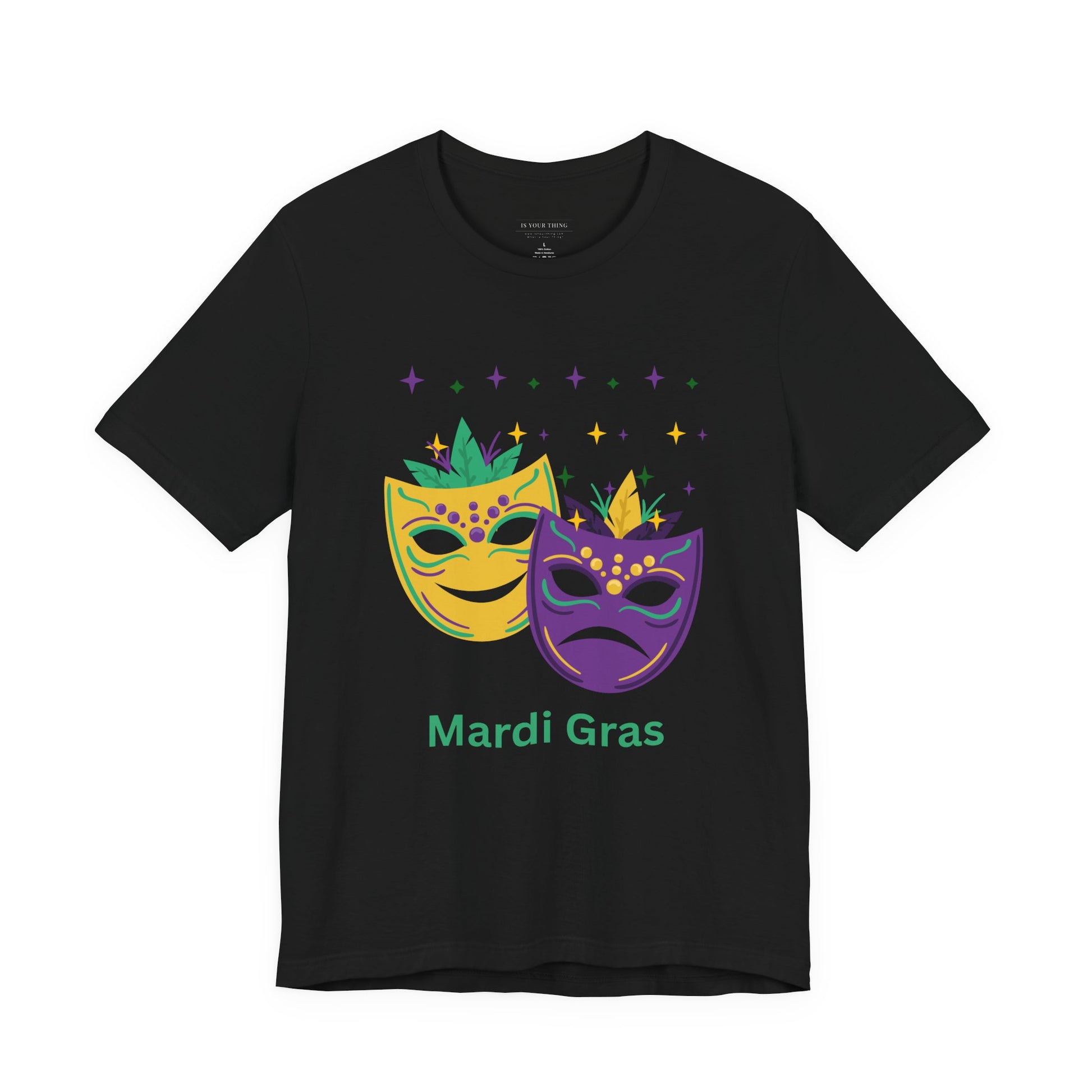 Celebrate the lively spirit of Mardi Gras with a soft, breathable tee that wears like a favorite memory. Two colorful carnival masks — one bright yellow with a green crown, one deep purple with gold accents — sit above playful confetti stars, bringing parade energy to a casual crewneck. Lightweight Airlume combed cotton keeps you cool while the retail fit and classic crew neckline layer smoothly under jackets or over long sleeves. Whether you’re heading to a local block party or adding festival flair to everyday outfits, this tee reads cheerful and proud without feeling loud. Ethically made blanks and a tear-away label keep comfort high and conscience clear.