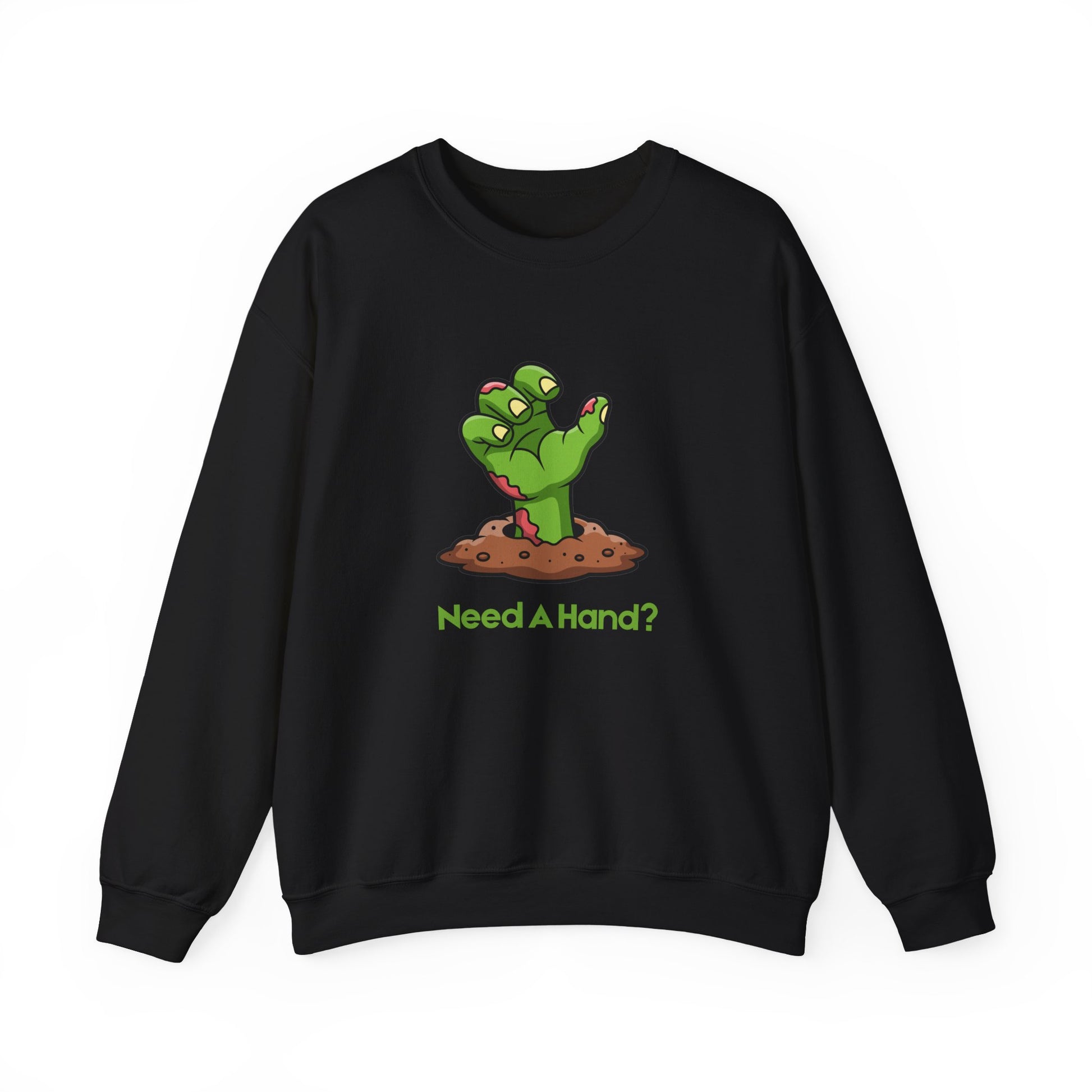 Slip into a cozy, slightly spooky vibe with this illustrated crewneck that balances comfort and playful horror. A bright, cartoonish green hand reaches from the earth with chipped nails and a cheeky question—Need A Hand?—printed beneath in matching green tones. The mid-weight cotton-poly blend keeps the fabric soft and warm without being bulky, while the classic crew neckline and clean double-needle stitching promise a durable everyday layer. Wear it on crisp evenings around a bonfire, to a casual Halloween party, or whenever you want to add a little tongue-in-cheek charm to your rotation. The graphic’s bold color pops against the deep black fabric, making the design visible from a distance but still easy to style with jeans, joggers, or layered under a jacket.