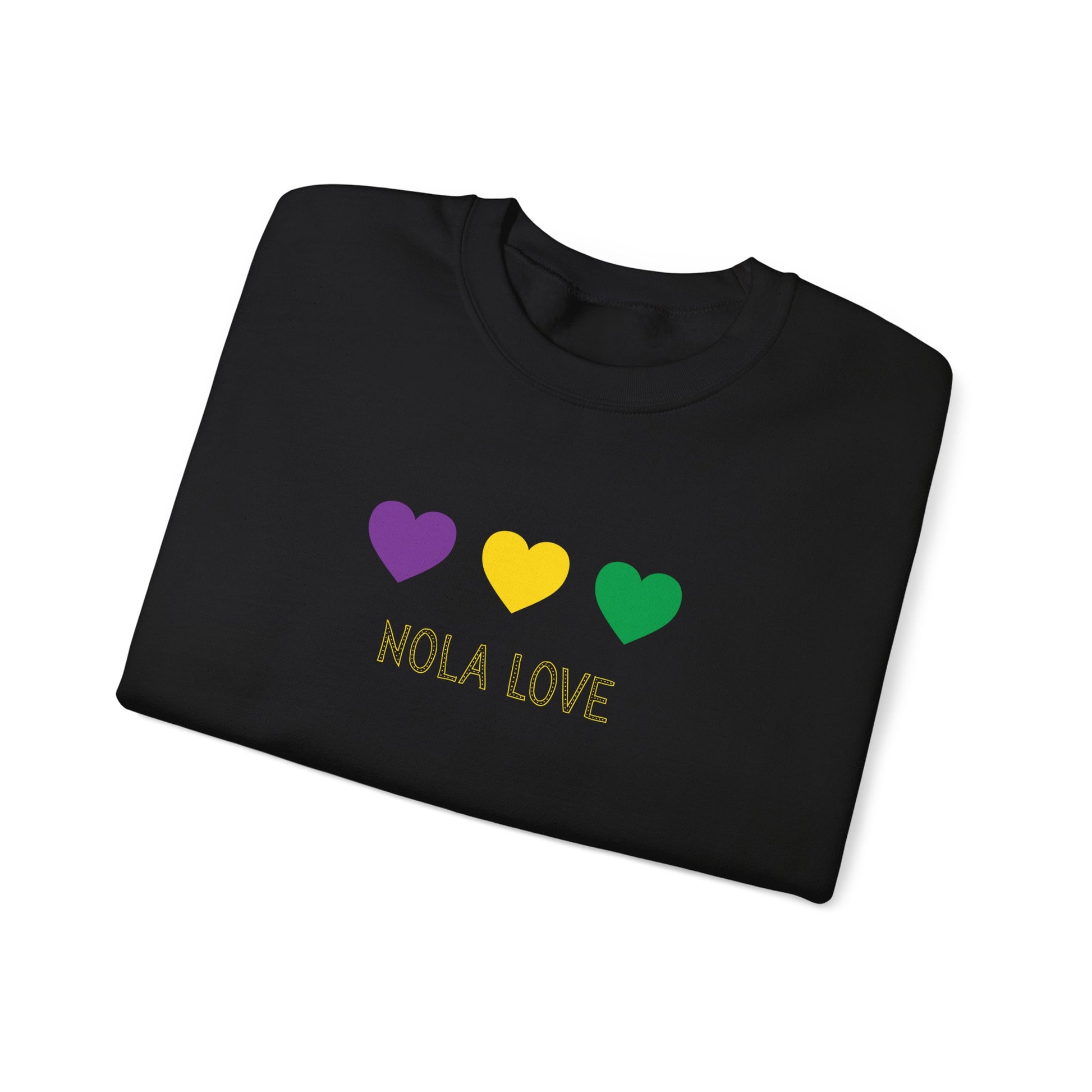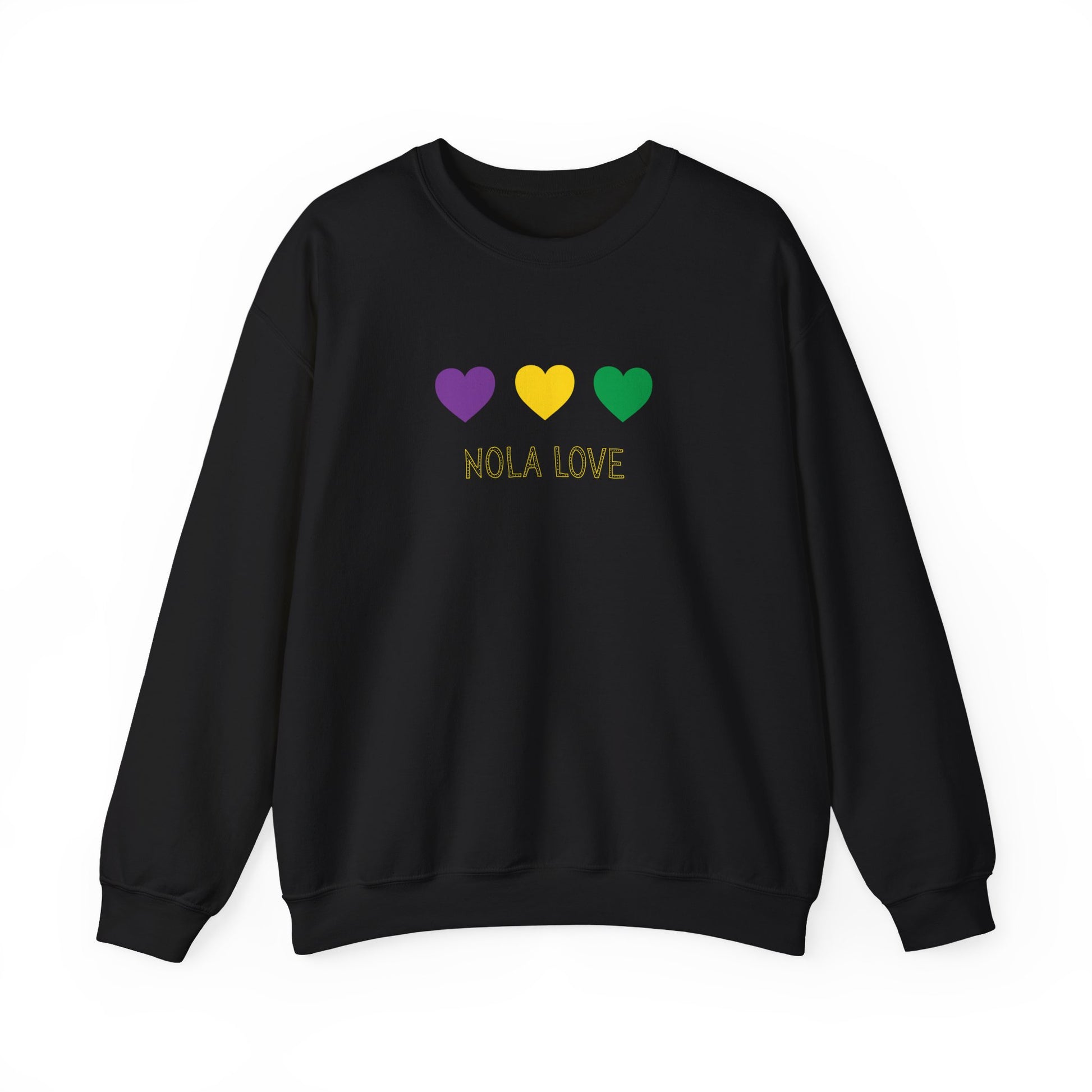 This cozy crewneck carries a slice of New Orleans warmth — three hearts in Mardi Gras purple, gold, and green floating above the hand-lettered "NOLA LOVE." It sits relaxed and roomy, a soft mid-weight sweatshirt that feels lived-in from the first wear. Throw it on for late-night porch talks, second-line strolls, or while sipping chicory coffee at sunrise. The embroidered-style print and deep black fabric make the colors pop, anchoring the piece in both street-ready style and at-home comfort. It’s built to last, breathable and sturdy through chilly crawfish boils, cool festival evenings, and slow mornings when the city hums outside the window.