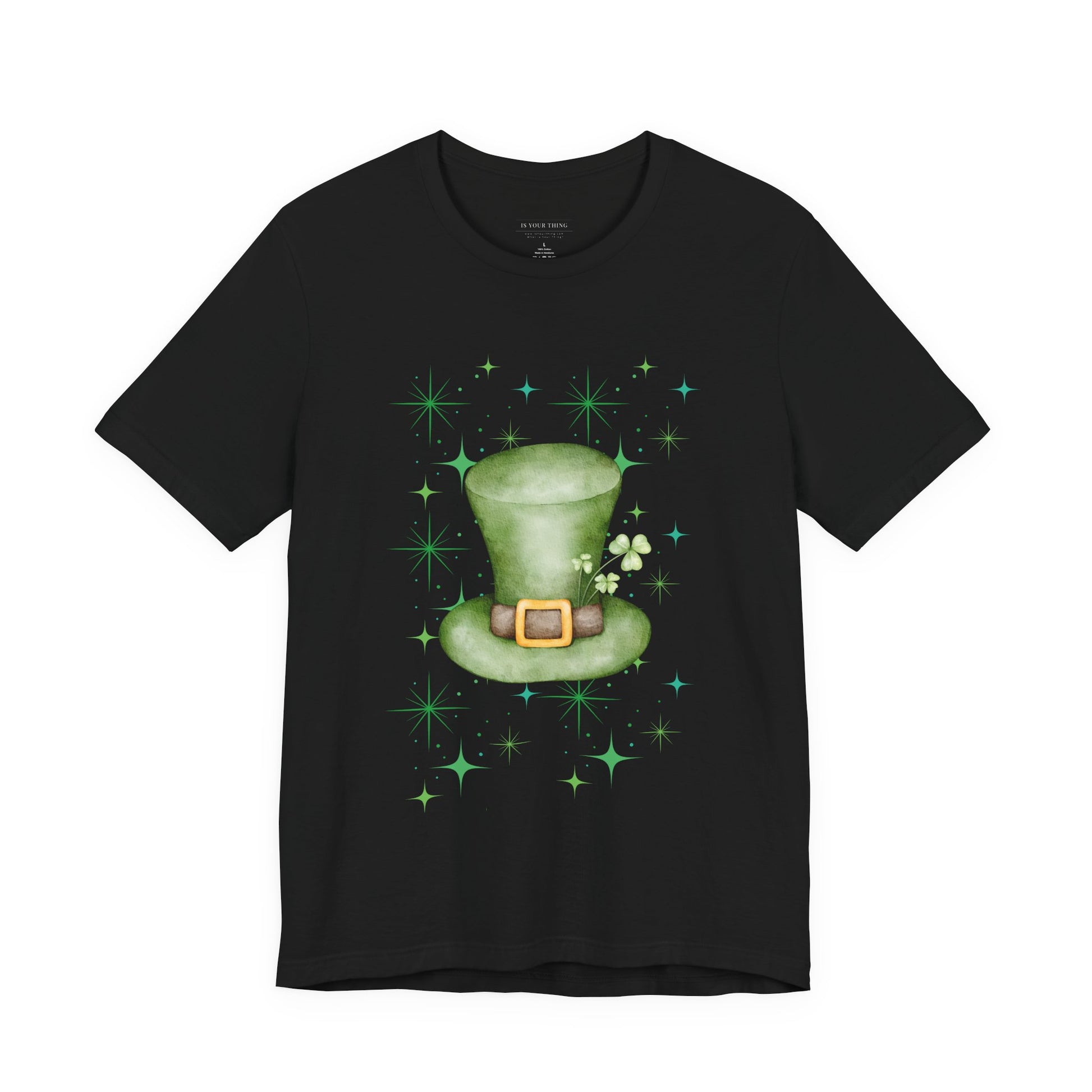 This lightweight jersey tee carries a playful, watercolor-style leprechaun hat surrounded by twinkling stars and tiny shamrocks — a subtle celebration of luck and Irish whimsy. The soft, breathable cotton fabric drapes easily for everyday wear, while the ribbed crew neckline and side seams keep the shirt looking neat through many washes. Wear it to casual gatherings, neighborhood pub nights, or anytime you want a touch of festive charm without shouting for attention. It sits well under a jacket or layered over a long sleeve when the weather turns, and the printed label and sleeves are rendered with crisp, vibrant techniques for long-lasting color.