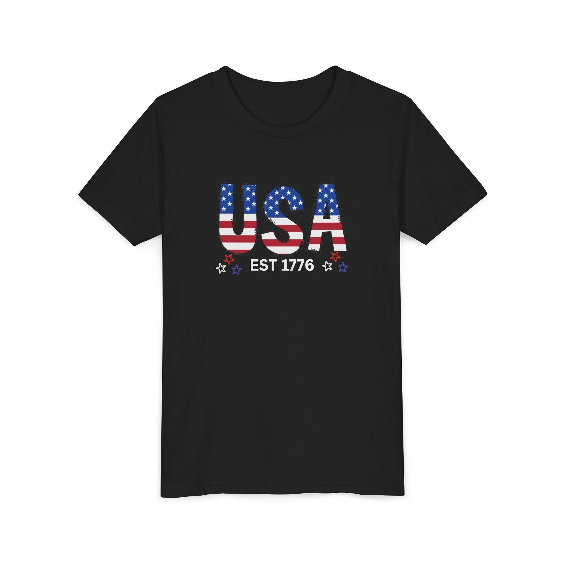 Lightweight, soft, and built for movement — this youth tee wears patriotism with a smile. The bold “USA” graphic, filled with stars and stripes and punctuated by “EST 1776,” sits bright against a clean background so kids can show off some national pride without fuss. The retail fit and crew neckline give a modern, relaxed silhouette that layers easily under hoodies or stands alone on warm days. Breathable airlume-combed cotton keeps little ones comfortable during parades, family barbecues, or backyard play. Thoughtful construction — side seams, shoulder tape, and a ribbed knit collar — helps the shirt keep its shape through washes and rough-and-tumble wear. Tear-away label and responsibly made blanks mean fewer itches and a clearer conscience.